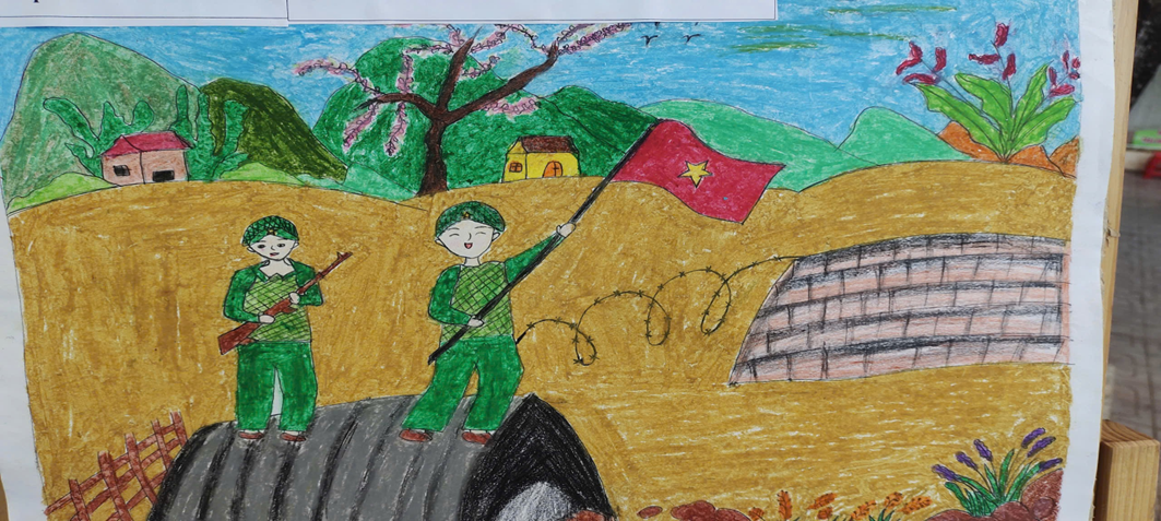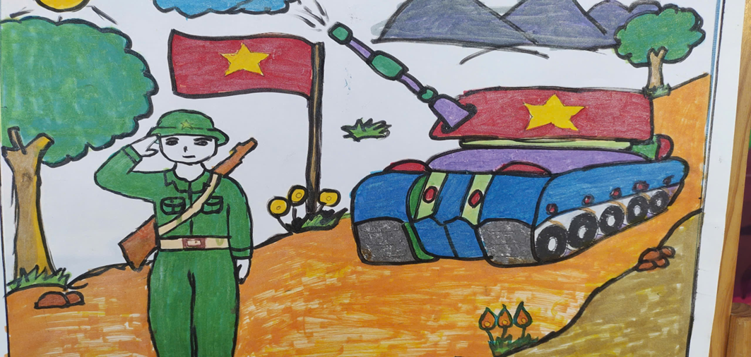 Hình ảnh người lính hiện đại: Nhiều tác phẩm khắc họa hình ảnh chú bộ đội không chỉ làm nhiệm vụ canh giữ biên cương, hải đảo mà còn sát cánh cùng người dân phòng chống thiên tai, dịch bệnh, tham gia cứu hộ – những hành động nhân văn thể hiện rõ nét tinh thần “vì nước quên thân, vì dân phục vụ” Kỷ niệm và ước mơ: Qua nét vẽ ngộ nghĩnh, các em còn gửi gắm những ước mơ giản dị về một tương lai hòa bình, tươi sáng, nơi đất nước luôn vững mạnh dưới sự bảo vệ của các chú bộ đội.Màu sắc và bố cục: Các bài vẽ nổi bật với màu sắc tươi tắn, bố cục rõ ràng, thể hiện sự hồn nhiên, trong sáng nhưng cũng rất sâu sắc trong cảm nhận của lứa tuổi tiểu học.