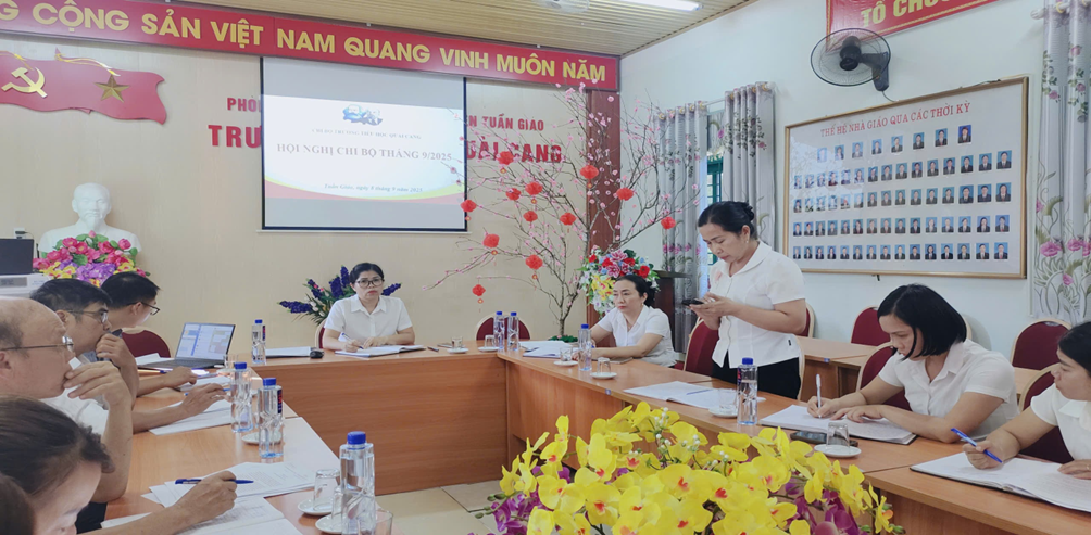 Chiều ngày 03/9/2025, Chi bộ Trường Tiểu học Quài Cang đã tổ chức sinh hoạt thường kỳ tháng 9/2025. Buổi sinh hoạt do đồng chí Nguyễn Thị Hồng – Bí thư Chi bộ chủ trì. Tham dự có đồng chí Nguyễn Quyết Thắng – Ủy viên Ban Thường vụ Đảng ủy, Phó Chủ tịch UBND xã Tuần Giáo và toàn thể 20/20 đảng viên trong Chi bộ.